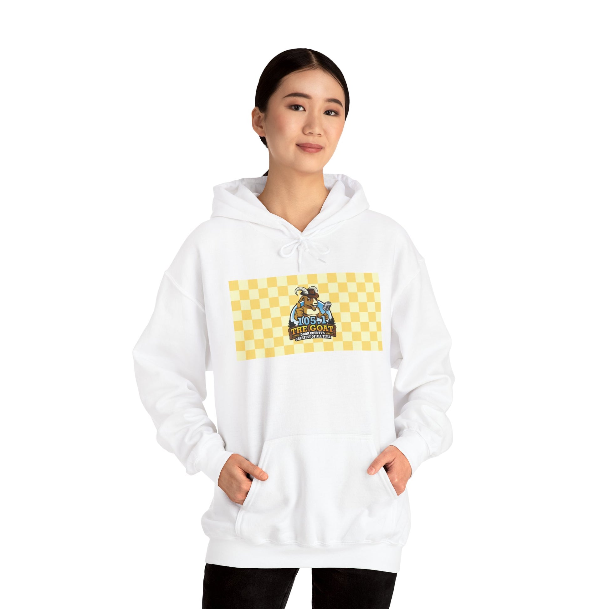 This GOAT vintage logo unisex heavy blend hooded sweatshirt is relaxation itself. Made with a thick blend of cotton and polyester, it feels plush, soft and warm, a perfect choice for any cold day. In the front, the spacious kangaroo pocket adds daily practicality while the hood's drawstring is the same color as the base sweater for extra style points.